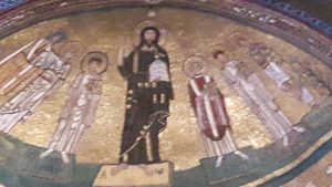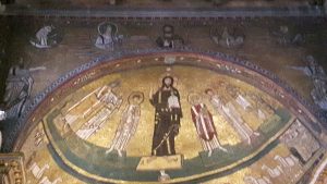 ristrutturazioni. Nel secolo IX fu ricostruita da parte di papa Gregorio IV, il quale fece realizzare un nuovo mosaico nell’abside, per fortuna ancora presente e ben conservato. Possiamo dire che il mosaico absidale appartiene in pieno a quella straordinaria fase denominata “rinascita carolingia”.